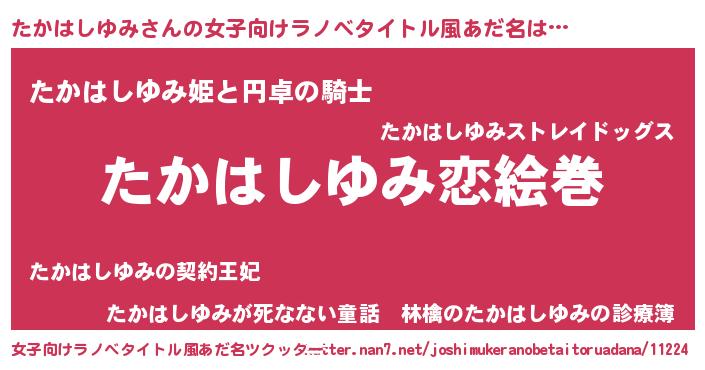 | 男性向けラノベタイトル風あだ名 | 『おまえをオタクにしてやるから、俺をたかはしゆみにしてくれ! 』 |