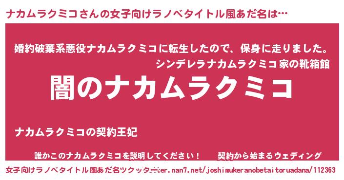 | 男性向けラノベタイトル風あだ名 | 『Re:ナカムラクミコから始める異世界生活』 |
