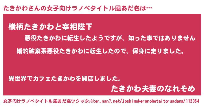 男性向けラノベタイトル風あだ名 | 『転生したらたきかわだった件』 |