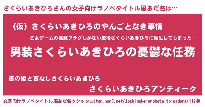 | 男性向けラノベタイトル風あだ名 | 『うちのさくらいあきひろが世界を掌握している!』 |