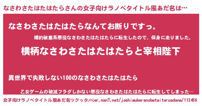 | 男性向けラノベタイトル風あだ名 | 『なさわさたはたはたらに滅ぼされるだけの簡単なお仕事です』 |