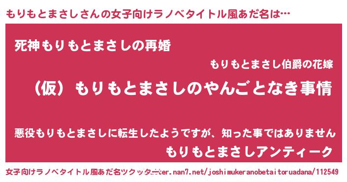 もりもとまさしさんの女子向けラノベタイトル風あだ名は… 『(仮)もりもとまさしのやんごとなき事情』『死神もりもとまさしの再婚』『もりもとまさしアンティーク』 ツクッター #女子向けラノベタイトル風あだ名ツクッター http://tkutter.nan7.net/joshimukeranobetaitoruadana/112549/