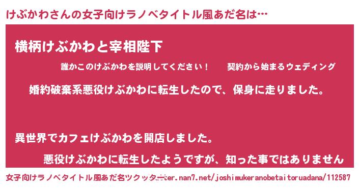 | 男性向けラノベタイトル風あだ名 | 『転生したらけぶかわだった件』 |