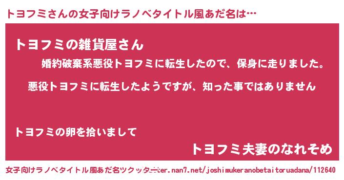 | 男性向けラノベタイトル風あだ名 | 『この素晴らしい世界にトヨフミを!』 |
