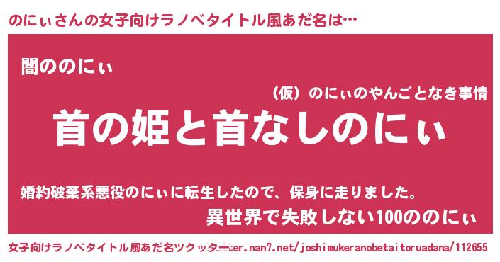 | 男性向けラノベタイトル風あだ名 | 『はたらくのにぃさま!』『のにぃの憂鬱』 |