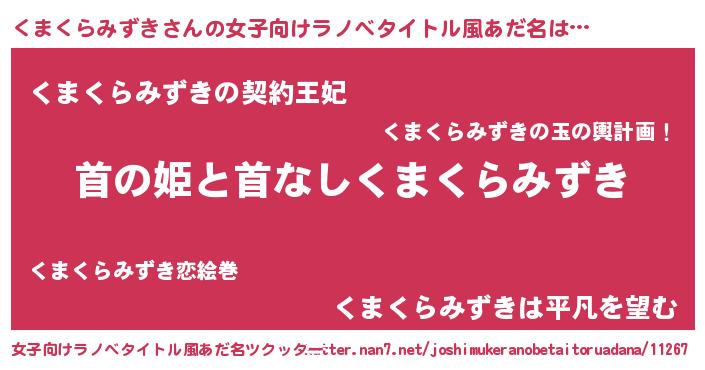 くまくらみずきさんの女子向けラノベタイトル風あだ名は… 『首の姫と首なしくまくらみずき』『くまくらみずきの契約王妃』『くまくらみずきは平凡を望む』 ツクッター #女子向けラノベタイトル風あだ名ツクッター http://tkutter.nan7.net/joshimukeranobetaitoruadana/11267/