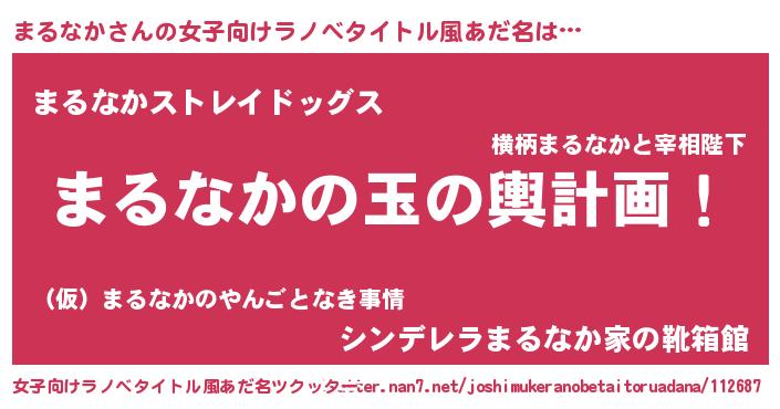 男性向けラノベタイトル風あだ名 | 『まるなか~年齢イコール彼女いない歴の魔法使い~』 |
