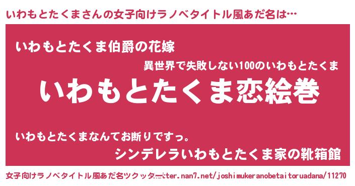 | 男性向けラノベタイトル風あだ名 | 『おまえをオタクにしてやるから、俺をいわもとたくまにしてくれ! 』 |