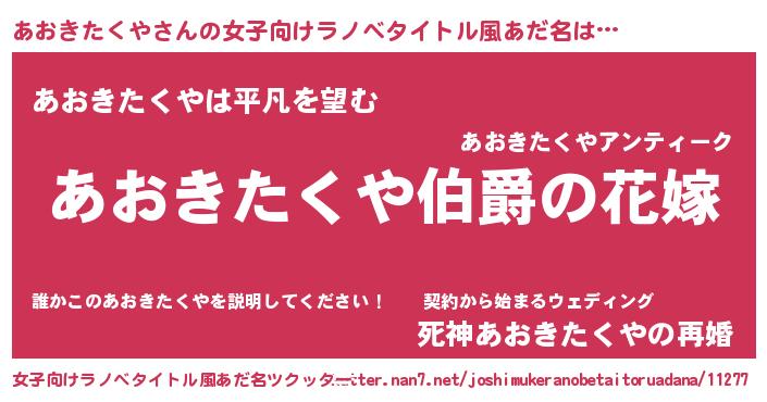 | 男性向けラノベタイトル風あだ名 | 『やはりあおきたくやの青春ラブコメはまちがっている 』 |