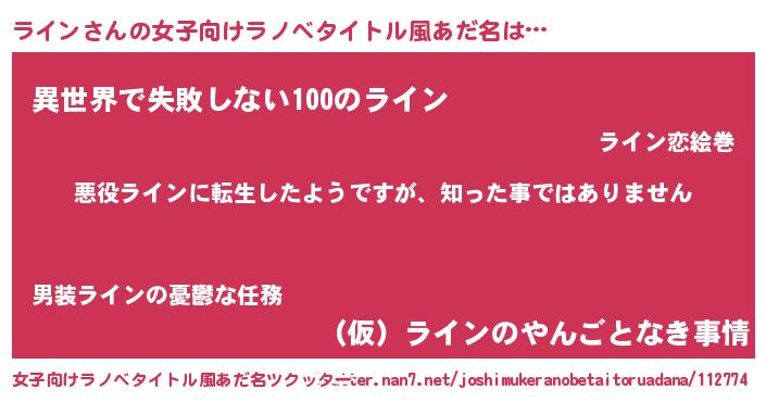 | 男性向けラノベタイトル風あだ名 | 『この素晴らしい世界にラインを!』 |