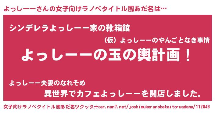 | 男性向けラノベタイトル風あだ名 | 『よっしーー~年齢イコール彼女いない歴の魔法使い~』 |