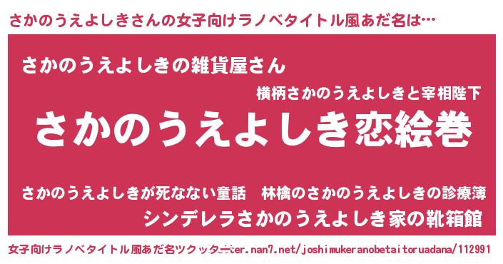 | 男性向けラノベタイトル風あだ名 | 『ノーゲーム・ノーサカノウエヨシキ』 |