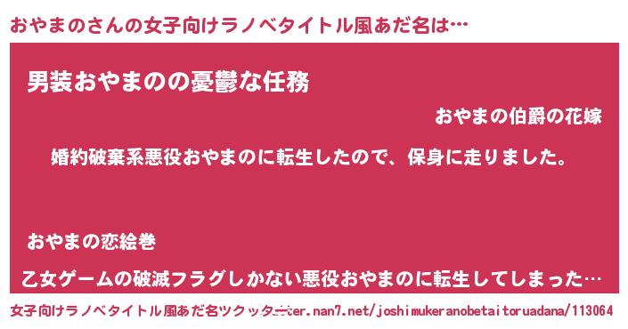 | 男性向けラノベタイトル風あだ名 | 『オヤマノスレイヤー』 |