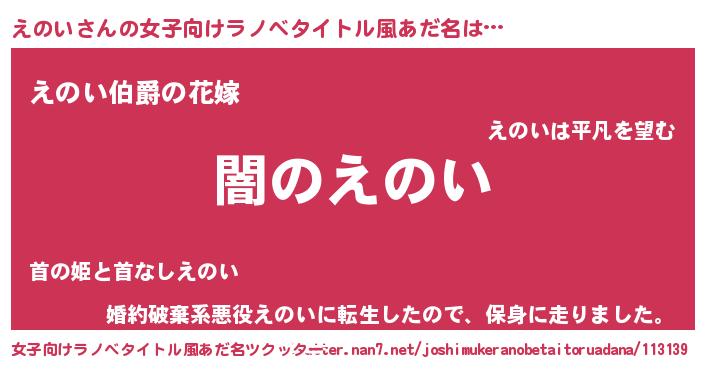 | 男性向けラノベタイトル風あだ名 | 『Re:えのいから始める異世界生活』 |