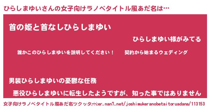 | 男性向けラノベタイトル風あだ名 | 『ヒラシマユイアートオンライン』 |