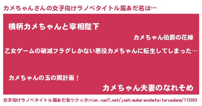 | 男性向けラノベタイトル風あだ名 | 『この素晴らしい世界にカメちゃんを!』 |