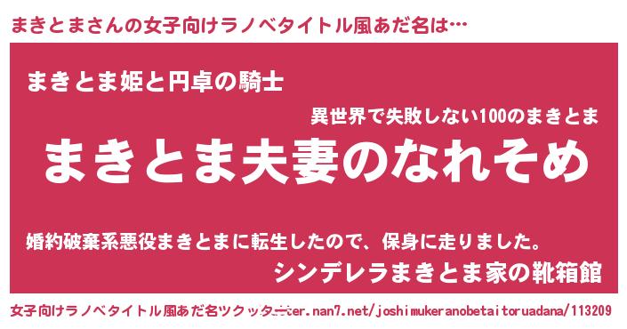 まきとまさんの女子向けラノベタイトル風あだ名は… 『まきとま夫妻のなれそめ』『まきとま姫と円卓の騎士』『シンデレラまきとま家の靴箱館』 ツクッター #女子向けラノベタイトル風あだ名ツクッター http://tkutter.nan7.net/joshimukeranobetaitoruadana/113209/