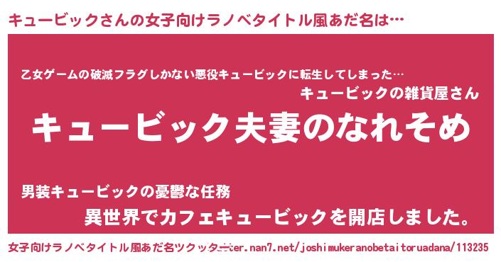 | 男性向けラノベタイトル風あだ名 | 『おまえをオタクにしてやるから、俺をキュービックにしてくれ! 』 |