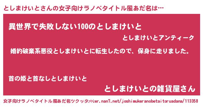 | 胡散臭い通販商品みたいなあだ名 | 『絶対に幸福をもたらす水素水…その名も「としまけいと」』 |