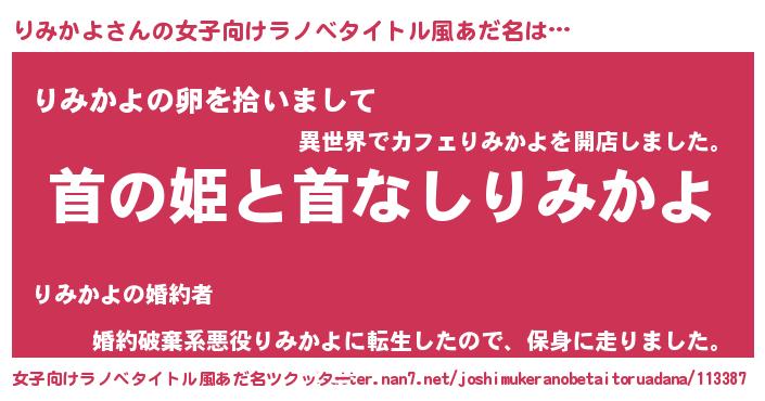 りみかよさんの女子向けラノベタイトル風あだ名は… 『首の姫と首なしりみかよ』『りみかよの卵を拾いまして』『婚約破棄系悪役りみかよに転生したので、保身に走りました。』 ツクッター #女子向けラノベタイトル風あだ名ツクッター http://tkutter.nan7.net/joshimukeranobetaitoruadana/113387/