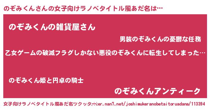 | 男性向けラノベタイトル風あだ名 | 『この素晴らしい世界にのぞみくんを!』 |