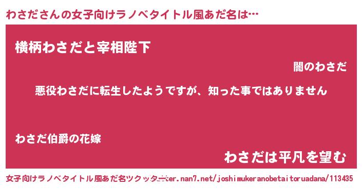 | 男性向けラノベタイトル風あだ名 | 『この素晴らしい世界にわさだを!』 |