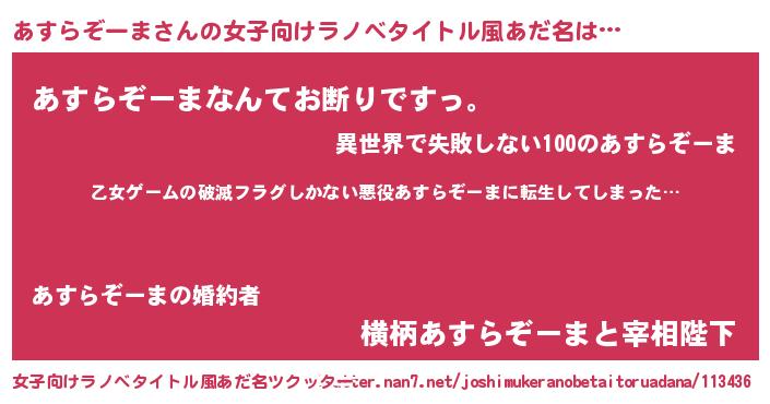 | 男性向けラノベタイトル風あだ名 | 『この素晴らしい世界にあすらぞーまを!』 |