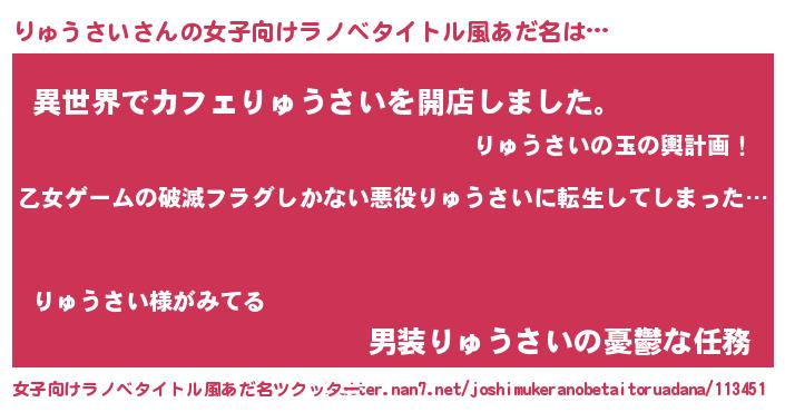 | 男性向けラノベタイトル風あだ名 | 『この素晴らしい世界にりゅうさいを!』 |