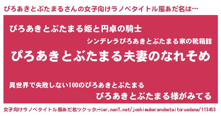| 男性向けラノベタイトル風あだ名 | 『おまえをオタクにしてやるから、俺をぴろあきとぶたまるにしてくれ! 』 |