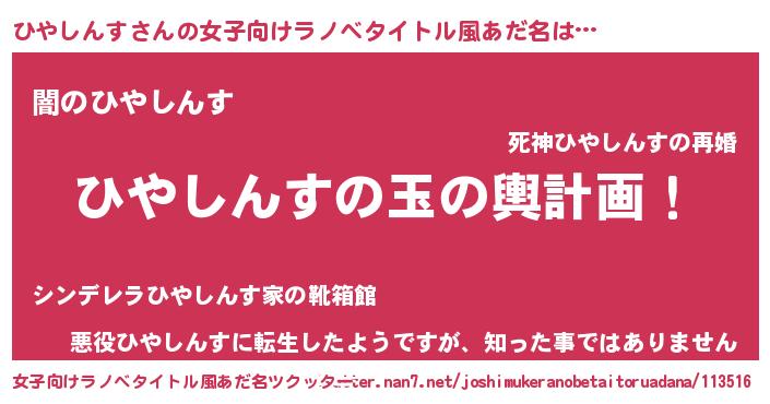 | 男性向けラノベタイトル風あだ名 | 『ひやしんす~年齢イコール彼女いない歴の魔法使い~』 |