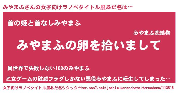 | 男性向けラノベタイトル風あだ名 | 『みやまふの嫁は女の子じゃないと思った?』 |