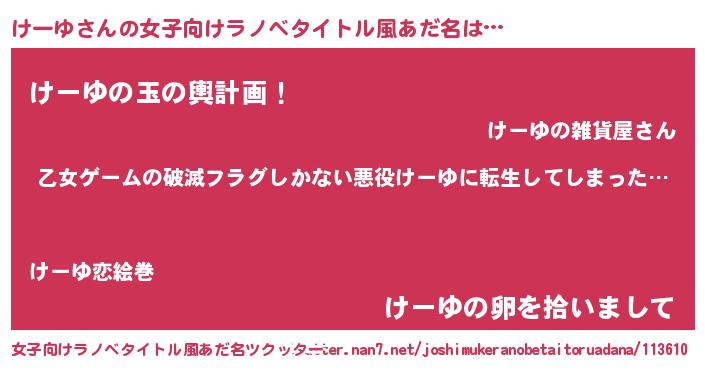 | 男性向けラノベタイトル風あだ名 | 『魔弾の王とけーゆ』 |