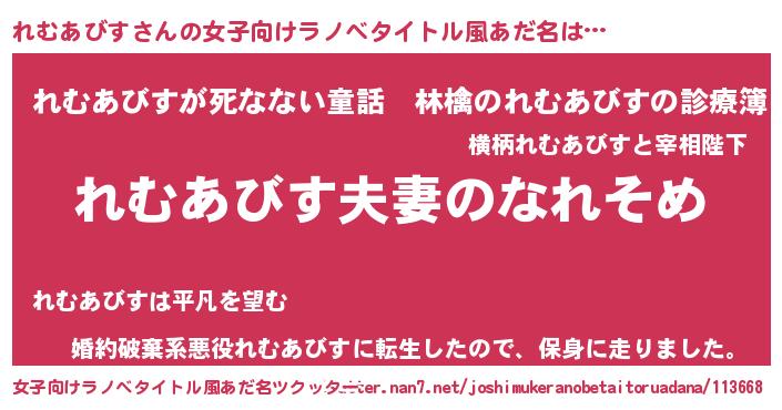 | 男性向けラノベタイトル風あだ名 | 『おまえをオタクにしてやるから、俺をれむあびすにしてくれ! 』 |