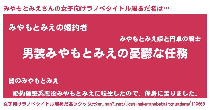 | 男性向けラノベタイトル風あだ名 | 『冴えないみやもとみえの育てかた』 |