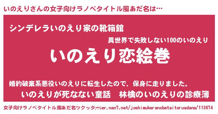 | 男性向けラノベタイトル風あだ名 | 『おまえをオタクにしてやるから、俺をいのえりにしてくれ! 』 |