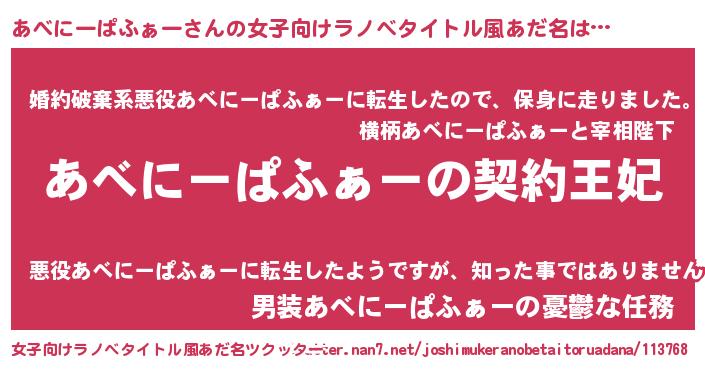 | 胡散臭い通販商品みたいなあだ名 | 『来世でも幸せになれる水素水…その名も「あべにーぱふぁー」』 |