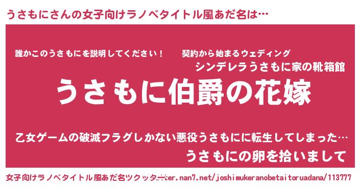 | 男性向けラノベタイトル風あだ名 | 『やはりうさもにの青春ラブコメはまちがっている 』 |