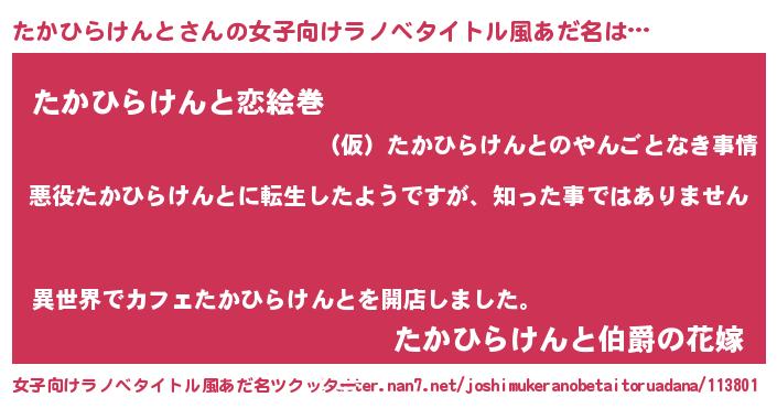 | 男性向けラノベタイトル風あだ名 | 『この素晴らしい世界にたかひらけんとを!』 |