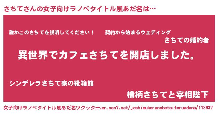 さちてさんの女子向けラノベタイトル風あだ名は… 『異世界でカフェさちてを開店しました。』『誰かこのさちてを説明してください! ~契約から始まるウェディング~』『横柄さちてと宰相陛下』 ツクッター #女子向けラノベタイトル風あだ名ツクッター http://tkutter.nan7.net/joshimukeranobetaitoruadana/113937/