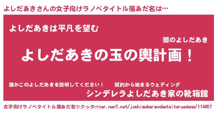 | 男性向けラノベタイトル風あだ名 | 『よしだあき~年齢イコール彼女いない歴の魔法使い~』 |