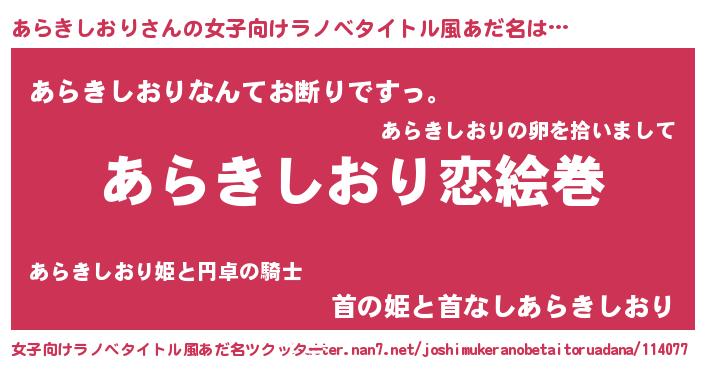 | 男性向けラノベタイトル風あだ名 | 『おまえをオタクにしてやるから、俺をあらきしおりにしてくれ! 』 |