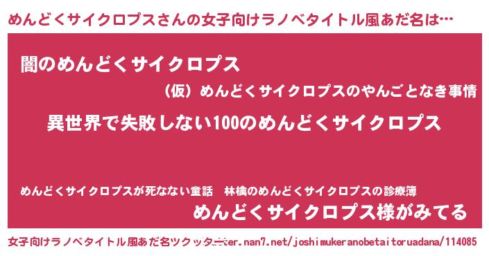 | 男性向けラノベタイトル風あだ名 | 『めんどくサイクロプスという概念が存在しない退屈な世界 』 |