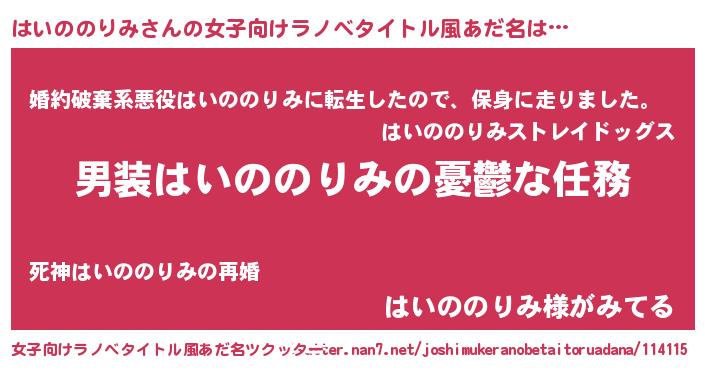 | 男性向けラノベタイトル風あだ名 | 『うちのはいののりみが世界を掌握している!』 |