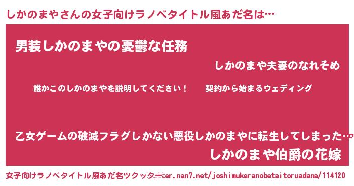 | 男性向けラノベタイトル風あだ名 | 『シカノマヤアートオンライン』 |