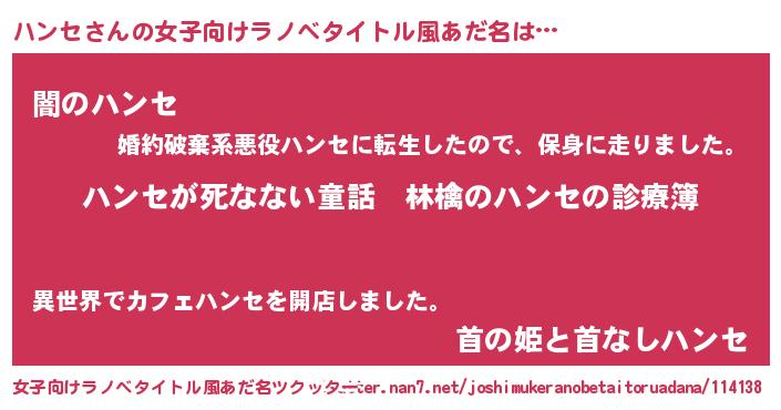 | 男性向けラノベタイトル風あだ名 | 『魔弾の王とハンセ』 |