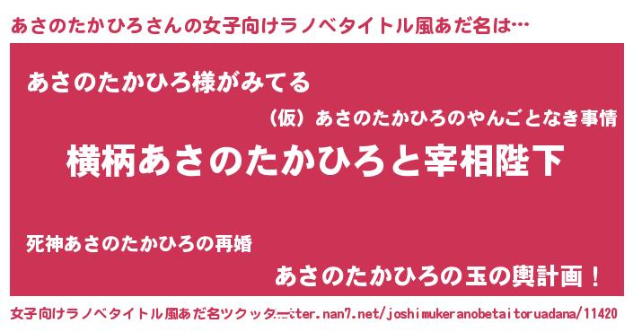 | 男性向けラノベタイトル風あだ名 | 『あさのたかひろに滅ぼされるだけの簡単なお仕事です』 |