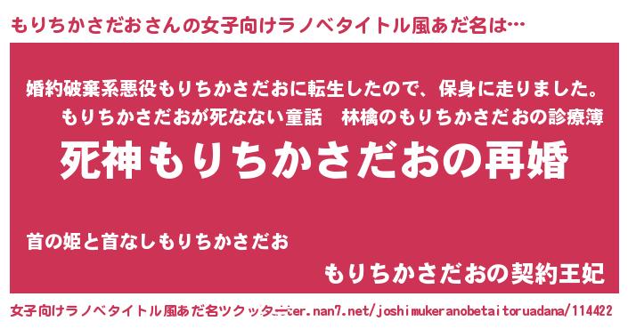 | 男性向けラノベタイトル風あだ名 | 『ノーゲーム・ノーモリチカサダオ』 |