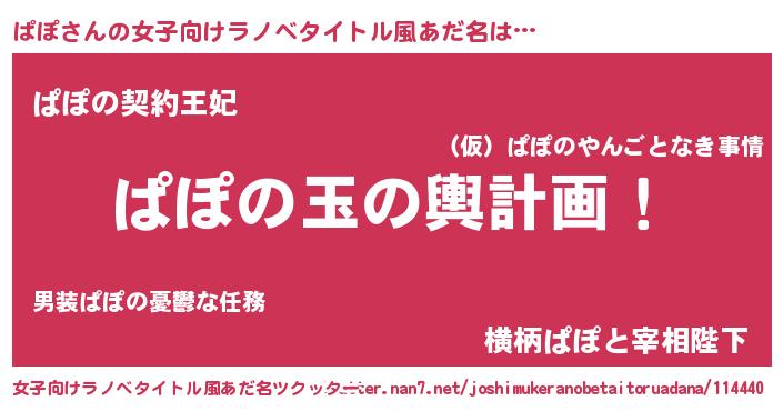 | 男性向けラノベタイトル風あだ名 | 『ぱぽ~年齢イコール彼女いない歴の魔法使い~』 |