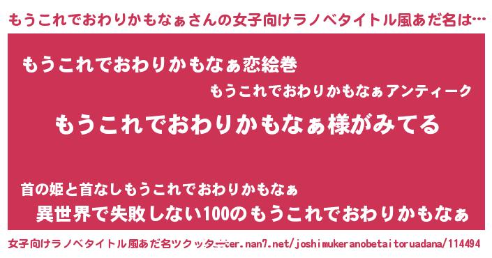 | 男性向けラノベタイトル風あだ名 | 『もうこれでおわりかもなぁの嫁は女の子じゃないと思った?』 |