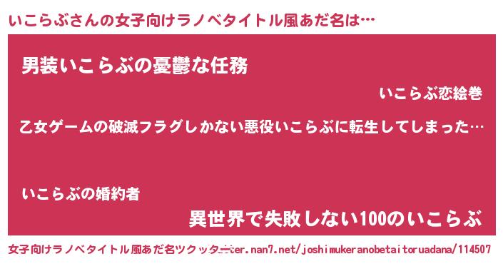 | 男性向けラノベタイトル風あだ名 | 『魔弾の王といこらぶ』 |